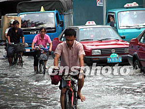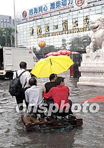 “杜鵑”臺(tái)風(fēng)給廣州帶來了狂風(fēng)暴雨,不少地方出現(xiàn)水淹現(xiàn)象,三日,廣州外貿(mào)中心正舉辦一個(gè)大型展覽,賓客們只好利用臨時(shí)拼造的“小舟”進(jìn)館。作者:梁永強(qiáng)