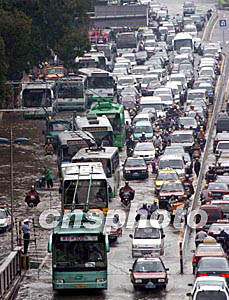 “杜鵑”臺(tái)風(fēng)給廣州帶來了狂風(fēng)暴雨,不少地方出現(xiàn)水淹現(xiàn)象,造成很多路段嚴(yán)重塞車。作者:梁永強(qiáng)