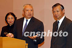 九月五日,香港行政長官董建華宣布撤回國安(立法條文)條例草案,強調(diào)無立法時間表,但希望早些完成。圖為出席此間記者會的香港律政司司長梁愛詩(左)、保安局局長李少光(右)。作者:潘索菲