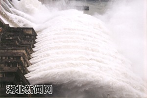 中新湖北網(wǎng)9月9日電 漢江第二次洪峰于八日凌晨一點(diǎn)到達(dá)丹江口水庫(kù),最大洪峰流量達(dá)二萬(wàn)八千五百立方米每秒,大約在今天下午五點(diǎn)丹江口水庫(kù)水位將達(dá)到一百五十六點(diǎn)七米,為一九八四年來(lái)最高水位。為緩解對(duì)水庫(kù)壓力,丹江口水庫(kù)開(kāi)閘向下游泄洪。劉鐵軍 攝