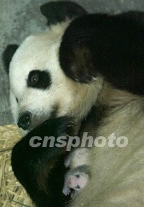 北京動物園8月24日出生的一只大熊貓幼崽,在初次做母親的“妞妞”十七天精心護養(yǎng)下度過最危險階段,如今小家伙已經(jīng)長出大熊貓?zhí)赜械暮谏珬l紋并不停地吱吱叫喊企圖脫離母親的懷抱。中新社記者:任晨鳴