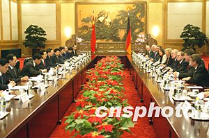 胡錦濤說,中德兩國人民有著長期友好交往的歷史,建交三十多年來,尤其是中國實行改革開放、德國重新實現統一后,兩國關系全面發(fā)展。兩國高層交往密切,雙方經貿合作不斷擴大。我們贊賞德國歷屆政府堅持一個中國政策,保持對華政策的連續(xù)性,致力于中德友好。