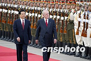 會談前,胡錦濤在人民大會堂東門外廣場為勞總統訪華舉行了歡迎儀式。