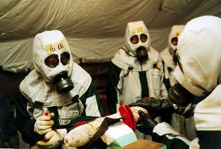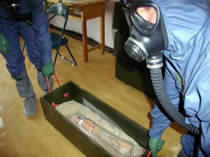 具體的處理程序是:金屬探測————先通過電磁探測,測出毒彈掩埋的準(zhǔn)確邊際,確定挖掘的方位;挖掘作業(yè)————使用銅針、銅鏟等器具,小心將已經(jīng)銹蝕、滲漏的毒氣彈挖掘出來;冷卻處理————將挖掘出的毒氣彈放置到零下40℃的冷藏柜,進行12個小時的冷卻,使毒氣彈溫度降到零下30℃;X光鑒別————通過大功率X光鑒別,搞清楚毒彈內(nèi)部結(jié)構(gòu);彈、藥分離———將彈體切割;外形鑒別;密封包裝。