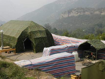 中新網(wǎng)9月13日電 昨天,天高氣清,從蓮花山往遠(yuǎn)處看,抱犢寨旅游風(fēng)景區(qū)的纜車在空中緩緩滑過。放眼身邊,是一排排規(guī)劃整齊的帳篷。其中一個最大的帳篷就是藁城毒氣彈運到鹿泉市后的埋藏點,也就是現(xiàn)在所說的“挖掘處理所”。這個帳篷的特殊之處在于,它是一個負(fù)壓通風(fēng)帳篷,里邊換氣需要通過特殊裝置,為的是一旦毒氣彈泄露,能夠控制在一定范圍,不至于泄到外邊。