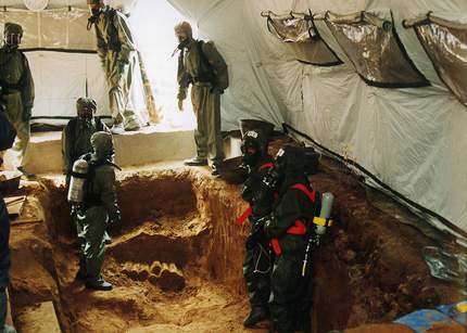 防化———挖掘現(xiàn)場搭建負(fù)壓通風(fēng)帳篷,一旦毒彈發(fā)生泄露,毒氣不易外泄。此次回收與以往最大不同在于,挖掘點使用的防毒面具是隔絕式的貯氣面具,所供氧氣為專供,以防止高濃度光氣對面具的穿透和芥子氣毒劑對人體的傷害。場區(qū)多點進行不間斷的空氣樣品毒劑檢測分析,及時發(fā)現(xiàn)毒劑泄露。