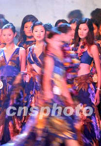 九月十三日晚,在2003年新絲路中國模特大賽海南三亞天涯海角的演出排練現(xiàn)場,身著絢麗晚裝出場的模特成為舞臺上流動的風景。中新社記者:盛佳鵬
