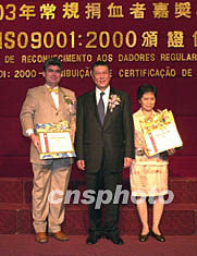 今日還同時(shí)舉行了澳門捐血中心獲得ISO九00一:二000質(zhì)量認(rèn)證頒證儀式,國家認(rèn)證認(rèn)可監(jiān)督管理委員會主任王鳳清專程前來頒發(fā)證書并致辭祝賀。