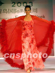 香港服裝設(shè)計(jì)師楊遠(yuǎn)振設(shè)計(jì)的大紅裙,十七日由俄羅斯模特兒在青島國際時(shí)裝周上展示。中新社記者:宋吉河