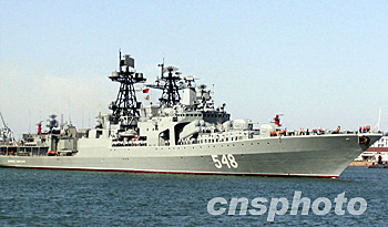 中國(guó)海軍北海艦隊(duì)某驅(qū)逐艦支隊(duì)“哈爾濱”號(hào)導(dǎo)彈驅(qū)逐艦執(zhí)行海上禮儀并陪訪!肮枮I”艦曾于1996年7月26日至8月2日,應(yīng)俄羅斯海軍邀請(qǐng)參加俄海軍建軍300周年慶;顒(dòng),當(dāng)時(shí)“潘捷列耶夫海軍上將”號(hào)大型反潛艦是“哈爾濱”艦的陪訪艦。(米晉國(guó))