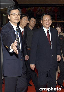 國務(wù)委員唐家璇(中)在國務(wù)院僑辦副主任、中新社社長劉澤彭(左),湖南省委副書記、代省長周伯華(右)等陪同下,二十一日在長沙出席“第二屆世界華文傳媒論壇”晚宴。中新社記者:武仲林
