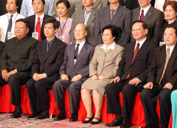 國務(wù)委員唐家璇(右二)二十一日接見“第二屆世界華文傳媒論壇”與會代表并合影留念。中新社 張宇 攝