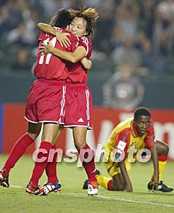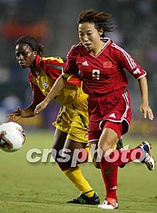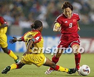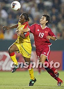 美國當(dāng)?shù)貢r間9月21日晚8點,中國女足參加了第四屆女足世界杯小組賽首場比賽,比賽對手是非洲勁旅加納隊,中國女足憑借老將孫雯的頭球以1比0戰(zhàn)勝加納隊,取得開門紅。 中國隊19號韓端與加納隊員爭頂。作者:劉占坤