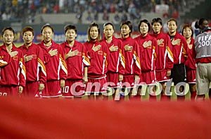 美國當(dāng)?shù)貢r間9月21日晚8點,中國女足參加了第四屆女足世界杯小組賽首場比賽,比賽對手是非洲勁旅加納隊,中國女足憑借老將孫雯的頭球以1比0戰(zhàn)勝加納隊,取得開門紅。圖為中國女足首發(fā)隊員面對國旗齊唱國歌。作者:劉占坤