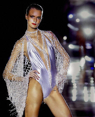 9月24日,在倫敦的2004春夏時裝周上,名模坎貝爾展示Julien Macdonald設(shè)計的新款時尚時裝,展露自己的性感身材。