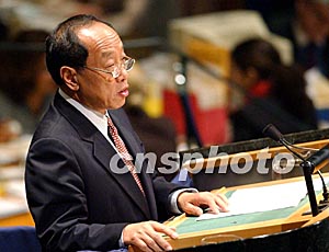 中國外長李肇星九月二十四日在第五十八屆聯(lián)大一般性辯論中發(fā)言時表示,為了維護(hù)世界和平,促進(jìn)共同發(fā)展,應(yīng)該加強國際合作,走多邊主義道路,促進(jìn)世界多極化。中新社記者:趙海燕