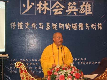 少林寺方丈釋永信在少林寺山門前主持盛大的歡迎儀式。釋永信在致歡迎詞時說:“嵩山論劍--中國互聯(lián)網(wǎng)新聞宣傳高峰論壇在少林寺召開,少林古剎古老的文明和現(xiàn)代科技將在這里碰撞與對接。