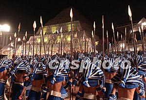 超大型景觀歌劇《阿依達(dá)》九月二十五日晚在北京工人體育場(chǎng)搭建的世界最大舞臺(tái)上進(jìn)行實(shí)況彩排。該劇場(chǎng)面鋪排、氣勢(shì)恢弘,其中群眾演員多達(dá)四千六百多人。圖為群眾演員扮演的古埃及士兵上場(chǎng)。中新社記者:張煒