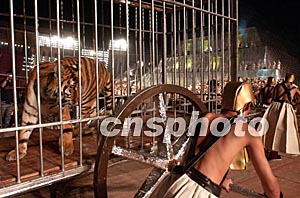 超大型景觀歌劇《阿依達(dá)》九月二十五日晚在北京工人體育場(chǎng)搭建的世界最大舞臺(tái)上進(jìn)行實(shí)況彩排。該劇場(chǎng)面鋪排、氣勢(shì)恢弘。圖為由象、獅、虎等動(dòng)物組成的車(chē)隊(duì)浩浩蕩蕩地上場(chǎng)。中新社記者:張煒