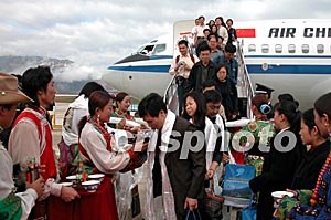 28日上午8點40分,104名來自全國各地的游客搭乘國航西南公司5027號波音737—600客機經過45分鐘的飛行順利抵達九寨黃龍機場,宣告九寨航線正式通航。圖為當?shù)夭刈迕癖姭I上青稞酒和哈達,迎接來自各地的首航游客。作者:易世忠