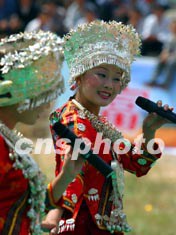 貴州省黔東南自治州苗族姑娘在國慶黃金周里以優(yōu)美的傳統(tǒng)山歌迎接游客。這個民族的青年男女有以歌傳情、以舞達意的風俗。中新社記者:宋吉河