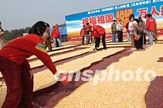 “十一國慶節(jié)”假日,在北京地壇公園舉辦的2003年北京書市上,《北京青年報(bào)》社在地壇祭壇400平米臺上,舉行《祝福祖國》萬人拼圖暨發(fā)行宣傳周活動(dòng),吸引數(shù)以千計(jì)民眾參與。她們將玉米、紅豆、黃豆、綠豆等五谷雜糧灑下,鋪成巨大的“祝福祖國”詞組,愿祖國大地五谷豐登。中新社記者:鄒憲