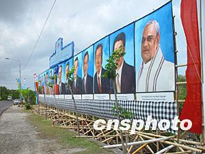 東盟系列峰會將于七日在印尼旅游勝地巴厘島揭幕,溫家寶等十四個與會國家領(lǐng)導(dǎo)人的巨幅頭像懸掛于道路兩旁。中新社記者 齊彬 攝