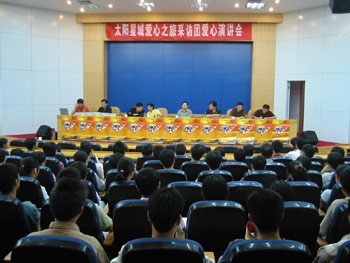 “太陽星城愛心之旅”采訪團在合肥工業(yè)大學(xué)的演講現(xiàn)場。(華夏時報圖 大漠攝)