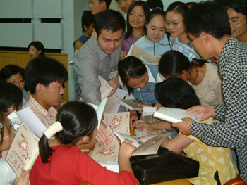 演講結(jié)束后,采訪團向合工大贈送了來自民間的思悟錄——〈牽手愛心〉,大學(xué)生們將“愛心之旅”成員周永琴、趙玉芝、宋體金、李繁民團團圍住,請他們簽字留念。(華夏時報圖 大漠攝)