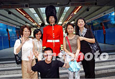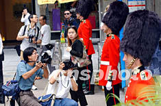 在國(guó)慶黃金周之際來(lái)香港 “自由行”的內(nèi)地游客,10月6日在中環(huán)鬧市巧遇國(guó)泰航空推廣活動(dòng),紛紛把握機(jī)會(huì)與英國(guó)衛(wèi)兵合影,顯得興高采烈。作者:統(tǒng)計(jì)員