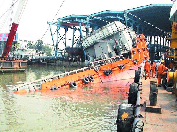 根據(jù)船舶資料顯示,該船空船重量達到1120噸,因為沉沒在珠江內(nèi)河,大型打撈船舶設(shè)備無法進入,給打撈工作造成很大困難。根據(jù)可用的船舶設(shè)備情況,打撈局采用穩(wěn)定難船、封艙抽水、使難船自浮的整體打撈方案。首先用300噸浮吊及潛水作業(yè)母船穩(wěn)定住沉船浮態(tài),對其進行必要的加固,防止其繼續(xù)下滑和左傾加大;慢慢移開左舷的浮船塢,然后水下封堵有關(guān)的孔蓋、海底閥及主甲板上的工藝開口,然后用潛水泵抽出船內(nèi)積水,使難船自浮,調(diào)整浮態(tài),現(xiàn)場交船。(幸琦昕許力夫張健文)