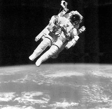 1984年6月7日,美國(guó)航天飛機(jī)“挑戰(zhàn)者”號(hào)宇航員布魯斯·麥坎德利斯使用載人機(jī)動(dòng)裝置,離開(kāi)航天飛機(jī)320英尺,完成了人類(lèi)首次無(wú)安全索太空行走。新華社圖