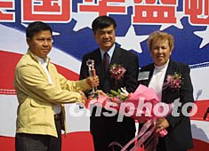 十五日上午,美國華盛頓州長駱家輝在率團(tuán)訪華期間專程來到廣東南海里水鮮果批發(fā)市場,在此為華盛頓蘋果大作廣告,并為一名業(yè)績出色的經(jīng)銷商頒發(fā)獎(jiǎng)杯。作者:柯小軍