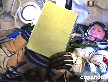 中國首位航天員楊利偉乘坐“神舟”五號(hào)飛船在太空飛行時(shí)展示航空日記。中新社 圖