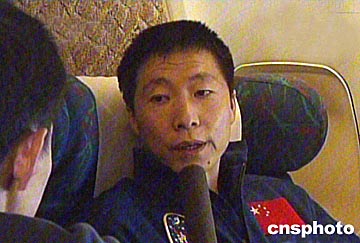 十月十六日,中國航天第一人楊利偉在從著陸點飛往北京的專機(jī)上接受中國中央電視臺采訪,描述飛船返回時的感受。中新社圖