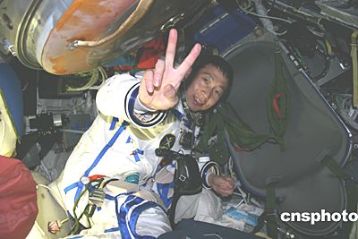 “神舟”五號載人飛船成功著陸,航天員楊利偉在返回艙艙內(nèi)用“V”字手勢示意勝利。作者:孫陽