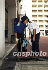 香港當局為加強預防登革熱的工作,教育統(tǒng)籌局及食環(huán)署現正進行為期一星期的巡視學校行動。圖為食環(huán)署人員十六日在梁式芝書院操場的水渠噴灑蚊油。中新社圖