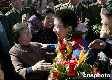 十月十六日上午,中國首位航天員楊利偉回到北京航天城航天員公寓,與母親重逢。作者:張桐勝