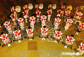 香港工聯(lián)會(huì)十六日晚在秀明小學(xué)舉行慶;顒(dòng),祝賀中國(guó)首次載人飛船上太空成功,氣氛熱烈。圖為慶祝會(huì)上的步操敲擊樂表演。作者:洪少葵