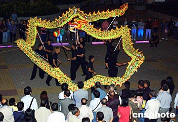 香港工聯(lián)會(huì)十六日晚在秀明小學(xué)舉行慶祝活動(dòng),祝賀中國(guó)首次載人飛船上太空成功,氣氛熱烈。圖為慶祝會(huì)上的金龍表演。作者:洪少葵