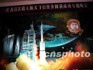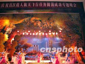 十月十六日晚,中國酒泉衛(wèi)星發(fā)射中心舉行專題晚會,慶祝中國首次載人飛行圓滿成功。中心的科技人員和部隊官兵載歌載舞,歡慶“神舟”五號飛船成功發(fā)射和中國首位航天員順利返回。