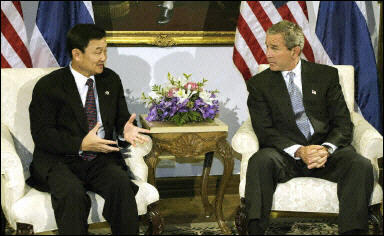報(bào)道稱,布什及夫人勞拉于周六晚些時(shí)候到達(dá)泰國(guó)。在嚴(yán)密的保安措施之下,布什與泰國(guó)總理他信舉行了會(huì)晤。據(jù)其隨從透露,布什將授予泰國(guó)“美國(guó)在北約外主要盟國(guó)”地位,并將給泰國(guó)提供一系列的援助,以感激泰國(guó)兩月前抓獲了“伊斯蘭團(tuán)”主要領(lǐng)袖漢巴里和其它的反控努力。