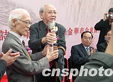 第九屆國際詩人筆會十月中旬在浙江金華開幕,來自亞洲、美洲、大洋洲10多個國家和地區(qū)近100位名家詩友會聚金華中國茶花文化園。三位對中國當(dāng)代詩歌做出卓越貢獻的詩歌大家馮至、鐘鼎文、余光中獲“中國當(dāng)代詩魂金獎”。圖為著名詩人文懷沙向余光中頒獎。作者:胡旭明