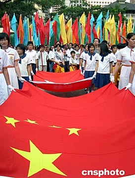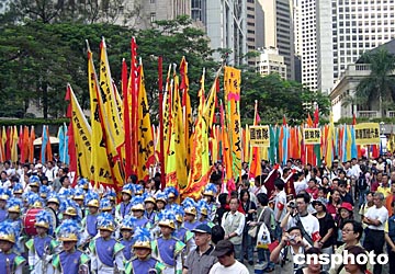 由香港民建聯(lián)等多個(gè)團(tuán)體組成的籌委會,十九日上午舉行祝賀中國首次載人飛船上太空成功大巡游活動(dòng),約五千名市民參加,氣氛熱烈。作者:譚達(dá)明