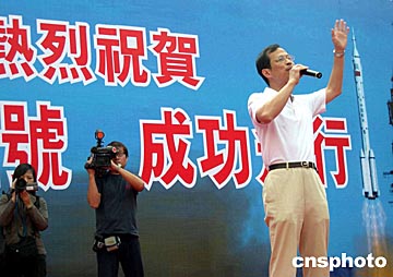 香港逾五千名來自十多個(gè)團(tuán)體的市民,十九日在中環(huán)遮打花園巡游,慶祝神舟五號成功載人上太空。圖為民建聯(lián)主席曾鈺成在臺上發(fā)言。作者:譚達(dá)明