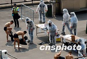 警方?jīng)_鋒隊(duì)為受到毒氣襲擊的傷者現(xiàn)場(chǎng)消毒清洗。中新社記者:洪少葵