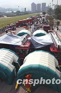 來自保安局、消防處、醫(yī)院管理局、醫(yī)療輔助隊(duì)、民安隊(duì)、天文臺(tái)、衛(wèi)生署和賽馬會(huì)共1300多人參與此次演習(xí)。中新社記者:洪少葵