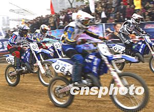 2003年“嘉陵杯”全國(guó)越野摩托車總決賽24日在重慶嘉陵賽車場(chǎng)拉開戰(zhàn)幕,來(lái)自全國(guó)21支隊(duì)伍120多名運(yùn)動(dòng)員參賽,為爭(zhēng)取全年的總排名爭(zhēng)奪異常激烈。中新社記者:趙振清