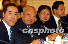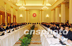 十月二十七日,滬港經(jīng)貿(mào)合作會(huì)議在香港禮賓府舉行,圖為香港特別行政區(qū)行政長(zhǎng)官董建華、財(cái)政司司長(zhǎng)唐英年、律政司司長(zhǎng)梁愛(ài)詩(shī)出席該會(huì)議。中新社記者:潘索菲