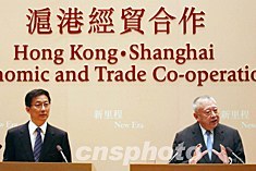 香港特區(qū)行政長(zhǎng)官董建華和上海市長(zhǎng)韓正,10月27日在香港政府總部會(huì)見(jiàn)傳媒,董建華表示,與上海市長(zhǎng)韓正討論滬港經(jīng)貿(mào)合作,雙方同意在八個(gè)領(lǐng)域加強(qiáng)合作。中新社記者:洪少葵